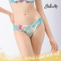 Phần phía trước của quần lót được làm từ chất liệu ren có in hoa văn, và hoa văn này được thiết kế để kết hợp hài hòa với các họa tiết thêu trên sản phẩm. Điều này tạo nên sự đồng bộ và tinh tế trong thiết kế.