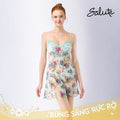 Chiếc váy ngủ nhẹ nhàng, êm ái mang đến cảm giác mặc thoải mái, được điểm xuyết bằng ren lấp lánh thể hiện hình ảnh vương miện và mái vòm xe ngựa – đưa bạn vào thế giới thần tiên như trong truyện cổ tích. Những bông hoa hồng đỏ nổi bật trên nền đơn sắc tạo ấn tượng mạnh mẽ. Mỗi bước di chuyển sẽ để lộ đôi chân qua đường xẻ tà sâu đầy quyến rũ. Thiết kế phía sau hở lưng rộng, tôn lên vẻ gợi cảm tinh tế. Hoa văn hoa hồng được tạo nên bằng kỹ thuật in độc đáo, tạo nên cảm giác sang trọng. Màu sắc được lấy cảm hứng từ đá topaz xanh – biểu tượng của hạnh phúc và may mắn.