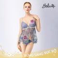 Mẫu áo đầm gợi cảm với thiết kế xuyên thấu, mang đậm phong cách Ả Rập đầy mê hoặc. Điểm nhấn nằm ở vẻ đẹp quyến rũ của ren, được tạo nên nhờ kỹ thuật in chồng màu tinh tế trên lớp thêu. Đường xẻ tà sâu táo bạo, khéo léo tôn lên đôi chân thon dài, mang lại vẻ đẹp quyến rũ đầy tự tin