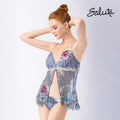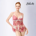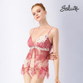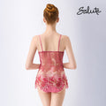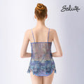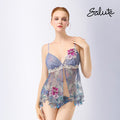 Mẫu áo đầm gợi cảm với thiết kế xuyên thấu, mang đậm phong cách Ả Rập đầy mê hoặc. Điểm nhấn nằm ở vẻ đẹp quyến rũ của ren, được tạo nên nhờ kỹ thuật in chồng màu tinh tế trên lớp thêu. Đường xẻ tà sâu táo bạo, khéo léo tôn lên đôi chân thon dài, mang lại vẻ đẹp quyến rũ đầy tự tin